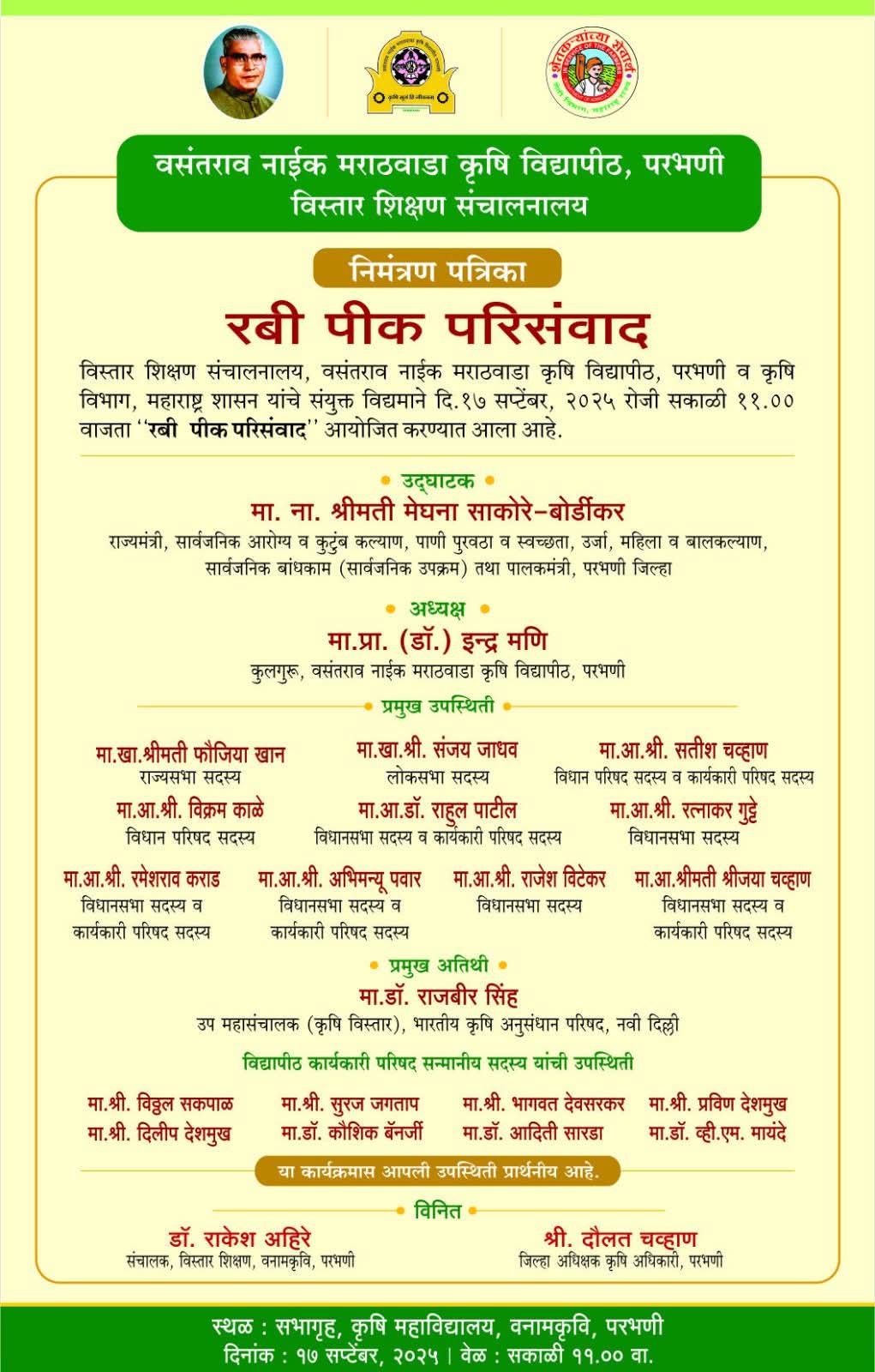 वसंतराव नाईक मराठवाडा कृषि विद्यापीठ, परभणी व कृषि विभाग,महाराष्ट्र शासन यांच्या संयुक्त विद्यमाने मराठवाडा मुक्ती संग्राम दिनाचे औचित्य साधून दि.१७ सप्टेंबर २०२५ रोजी *रबी शेतकरी मेळावा व पीक परिसंवाद* कार्यक्रमाचे आयोजन करण्यात आलेले आहे.